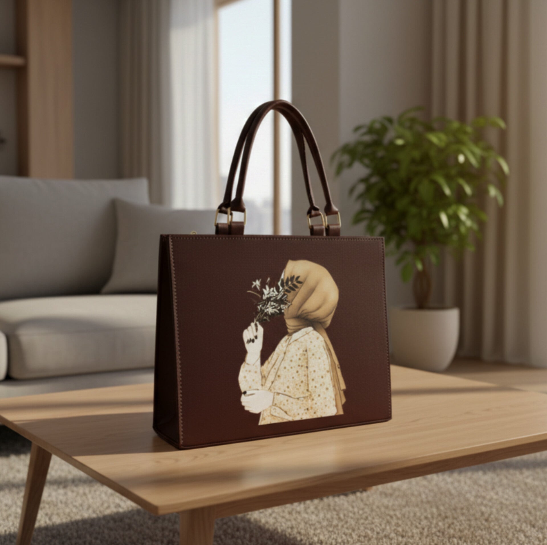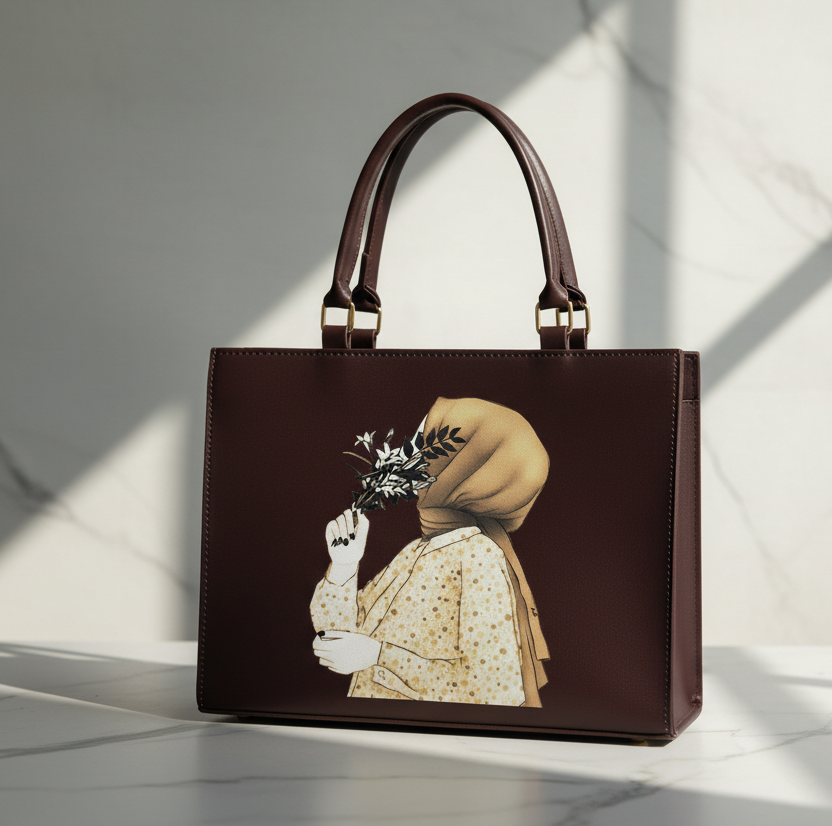 The "Anoor Tote Bag" is a statement piece, blending artistic expression with everyday functionality. Featuring a captivating print of a woman in a red headscarf holding delicate flowers, this tote adds a touch of modern elegance to any outfit. Crafted with quality materials and a spacious interior, it's perfect for carrying your essentials in style.