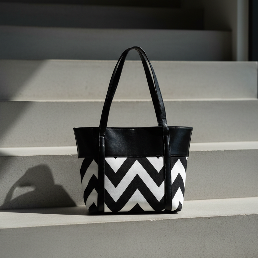 The Ariana is a stylish and functional tote bag that combines classic elegance with a modern twist. Its bold chevron pattern in black and white adds a touch of vibrancy, while the contrasting leather handles and trim lend a sophisticated touch. The spacious interior provides ample room for your daily essentials, making it the perfect everyday companion.