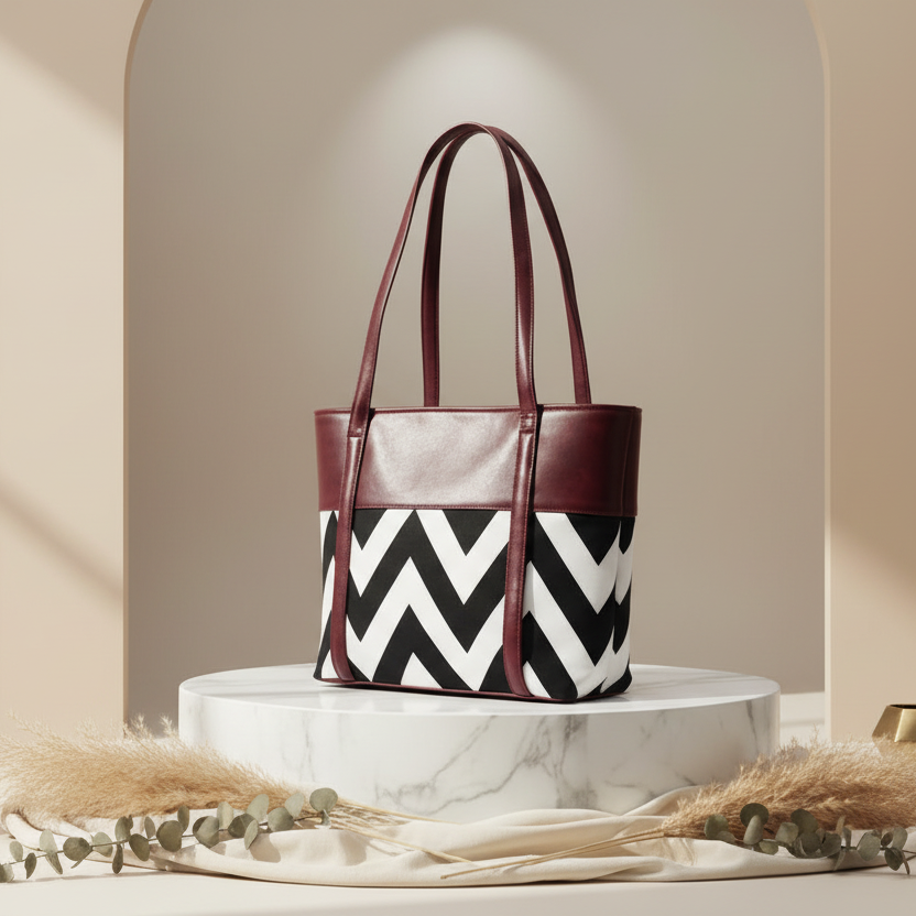 The Ariana is a stylish and functional tote bag that combines classic elegance with a modern twist. Its bold chevron pattern in black and white adds a touch of vibrancy, while the contrasting leather handles and trim lend a sophisticated touch. The spacious interior provides ample room for your daily essentials, making it the perfect everyday companion.